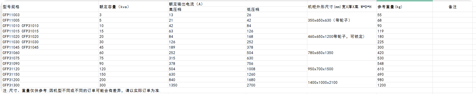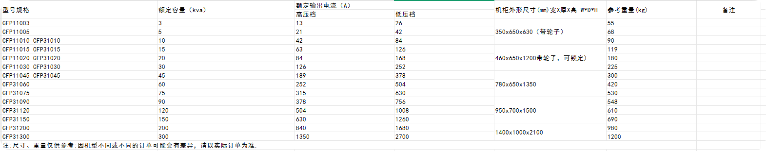 | 型號(hào) | 額定容量 (KVA) | 額定輸出電源(A) | 機(jī)柜外形尺寸 | 備注 | |